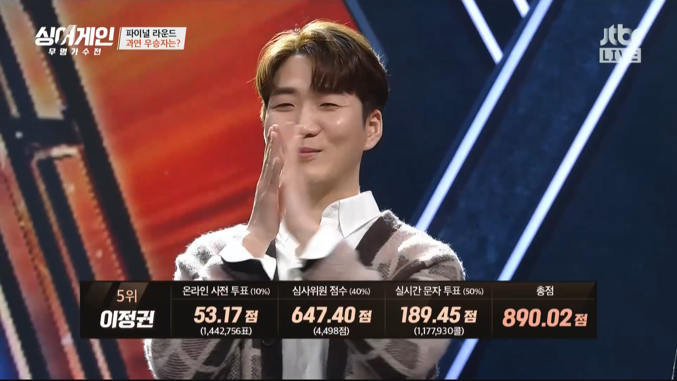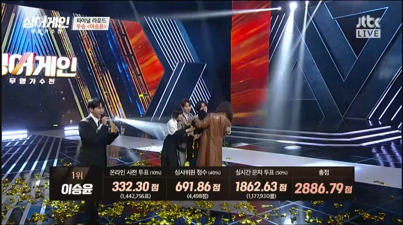 이승윤은 온라인 사전 투표, 실시간 문자 투표에서 압도적인 표를 받아 우승을 하게 되었어요.