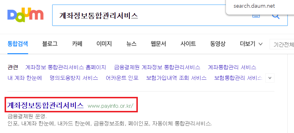 이번에는 인터넷 검색창에 계좌정보통합관리서비스 라고 검색 해 주세요.