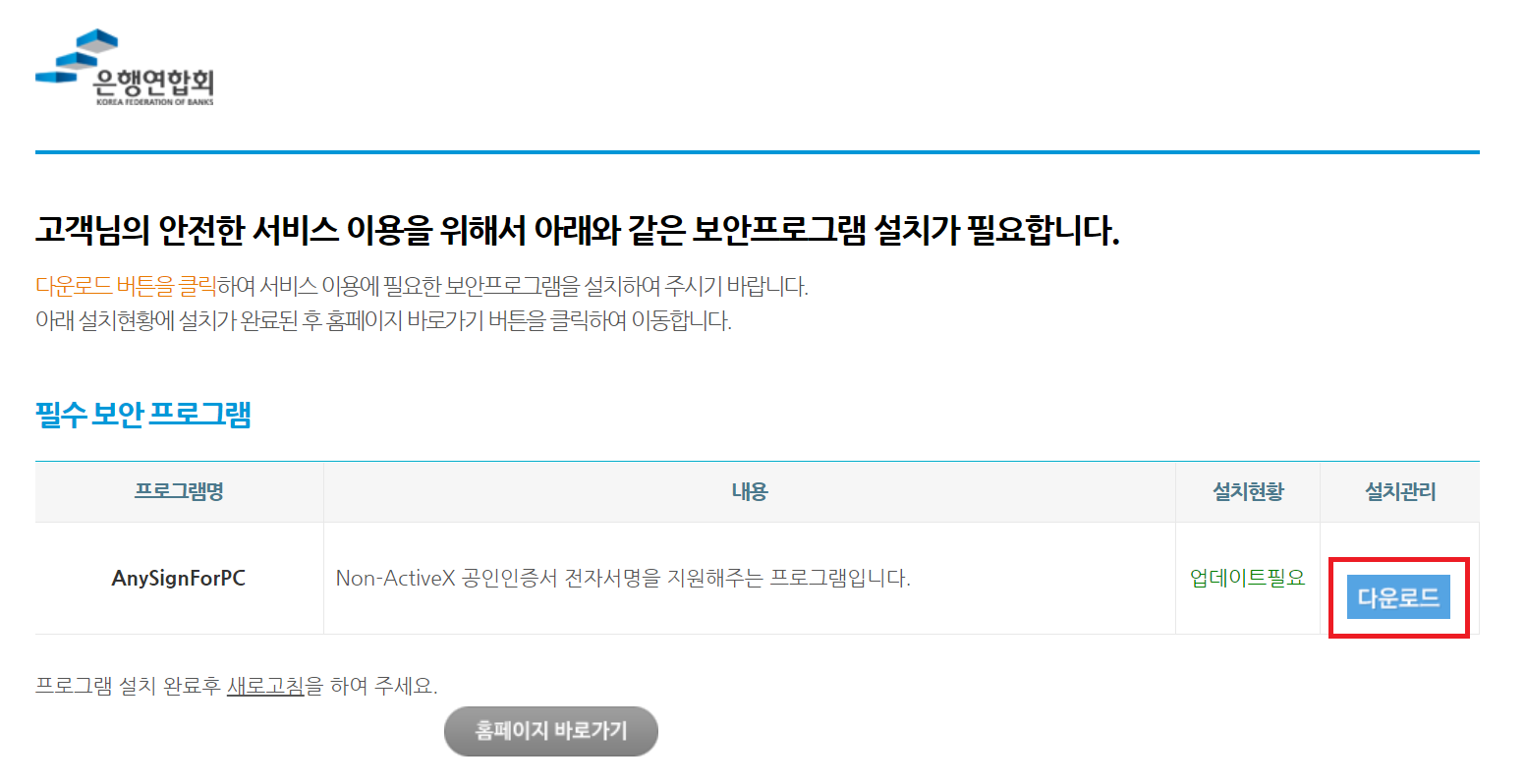 다운로드 버튼을 클릭해 보안프로그램을 설치 해 주시고, 설치가 완료 되면 새로고침 해 주세요.