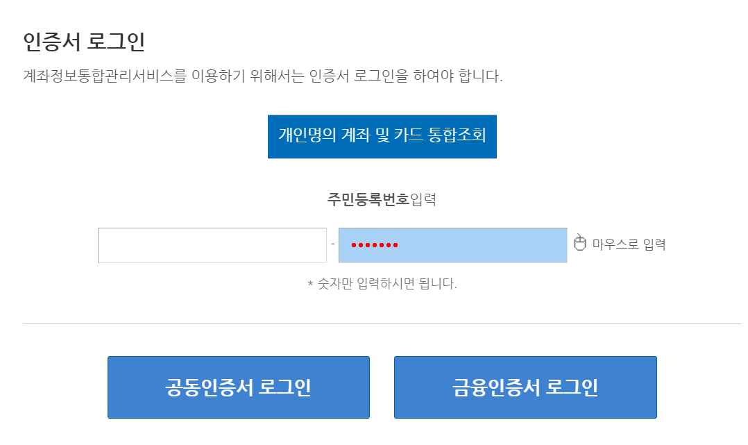 주민등록번호를 입력하신 뒤 공동인증서 로그인 혹은 금융인증서 로그인을 진행 해 주세요.
