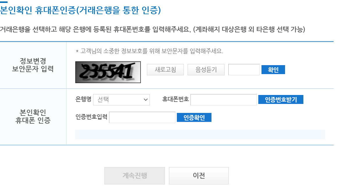 보안문자를 보이는대로 입력하신 후 확인 버튼을 누르시고, 그 다음으로는 휴대폰 인증을 진행 해 주세요.