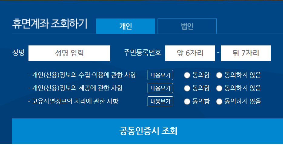 성명과 주민번호를 입력하시고 개인정보수집 동의 등 동의함에 클릭하신 후 공동인증서 조회 버튼을 클릭 해 주세요.