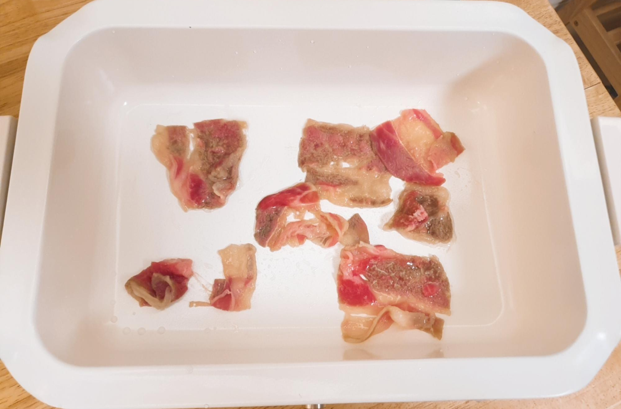 먼저 우삼겹을 팬에 넣고 핏기가 없어질 때 까지 볶아 줍니다.